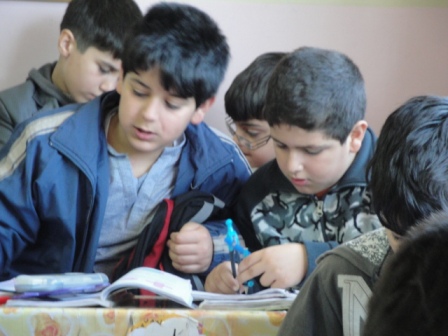 3- دهانه پرگار را به اندازه 4سانت باز کنید و سر سوزنی پرگار را سر دیگر پاره خط 5 سانتیمتری بگذارید و یک کمان بکشید .